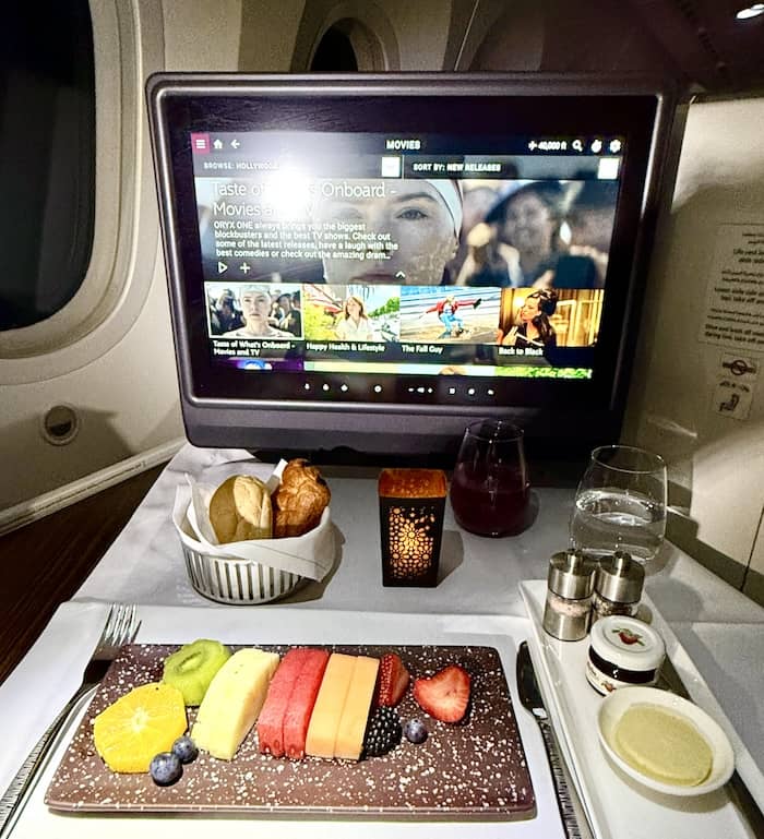 After being wined and dined I usually recline my seat and watch a movie on the 17-inch flat screen TV. Qatar Airway’s Oryx One system has over 8,500 in-flight entertainment options.