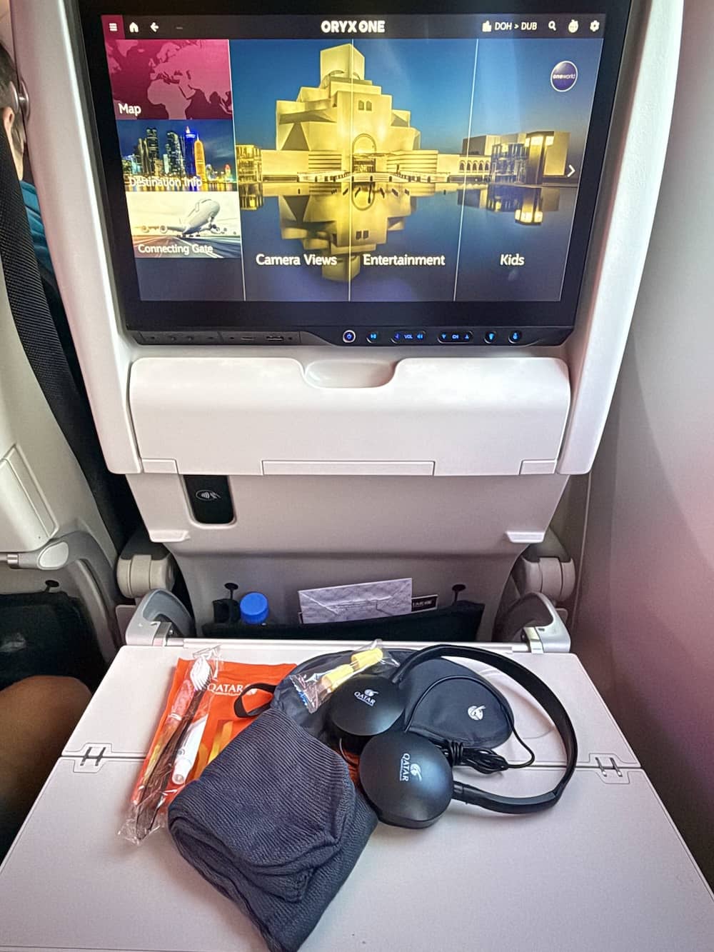 On my latest flight to Doha Airport, I received an amenity kit filled with luxury brand Diptyque products, including a mini perfume which I particularly liked. Noise cancelling ear phones, White Company pyjamas and luxurious velour blankets are always provided.