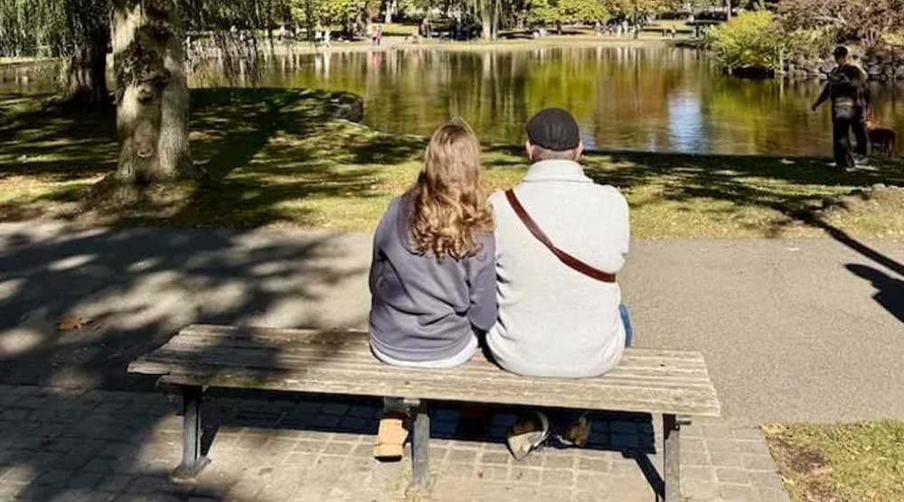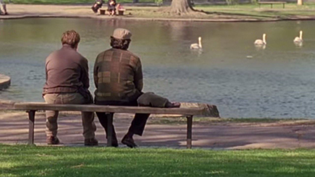 In real life, the bench is really there in Boston Common which spans 50 acres in downtown Boston, for long walks, viewing monuments, and recreational areas. Visitors can stroll the same grounds, visit the public garden, or simply enjoy the historic urban oasis.