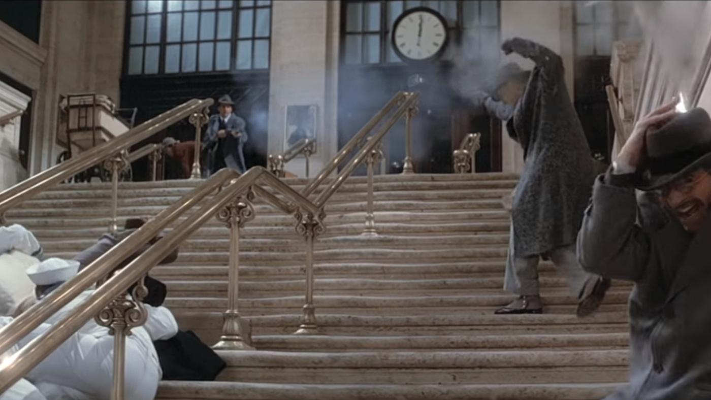 On screen, the station is the setting for one of the film’s most famous action sequences: the escalator shootout, where Eliot Ness (Kevin Costner) and his team have a shootout with gangsters led by Al Capone (Robert De Niro). Its stations dramatic architecture — soaring ceilings, marble floors, and wide staircases — provides a drmatic background for the tension in the movie scene.