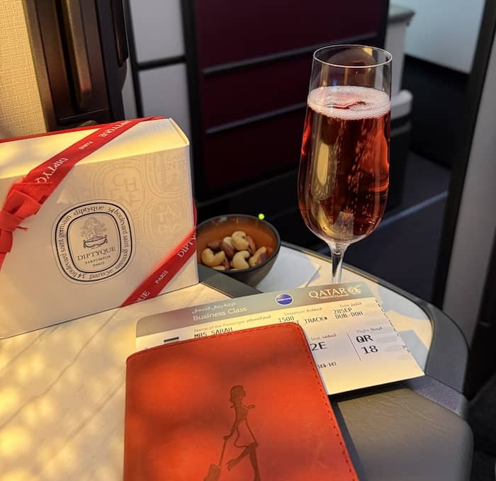 On my latest flight to Doha Airport, I received an amenity kit filled with luxury brand Diptyque products, including a mini perfume which I particularly liked. Noise cancelling ear phones, White Company pyjamas and luxurious velour blankets are always provided.