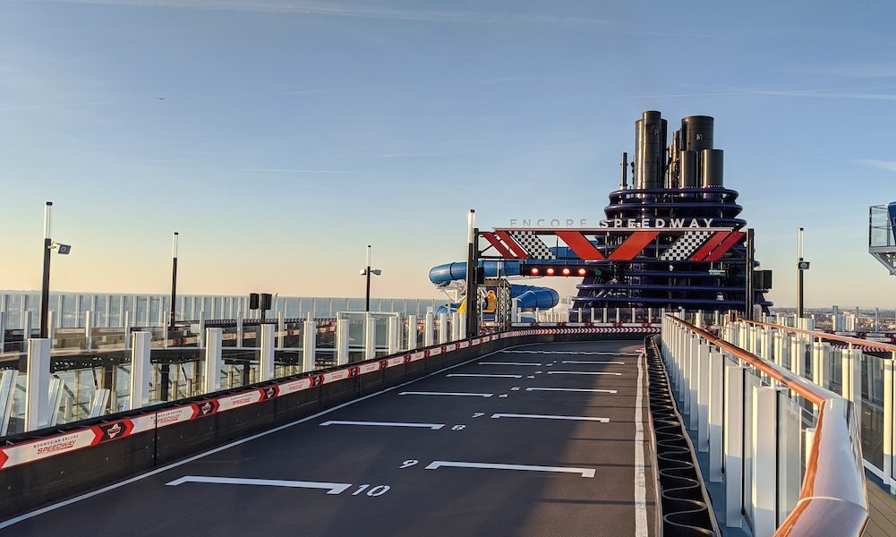 Norwegian Encore has a race track on the top deck, and I was the first person to test drive it! The race track is 1,150 feet long, sprawls over two decks and extends up to 13 feet over the side of the ship – it really is hard to fathom unless you see it, or in my case race it.