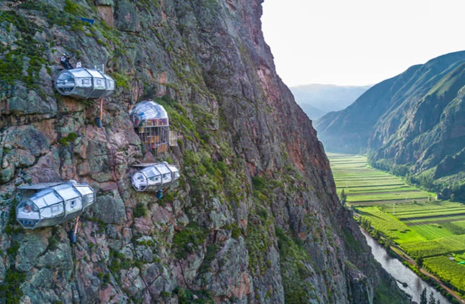 Suspended 1,200 feet above the ground on a cliff side in Peru’s Sacred Valley, the Skylodge Adventure Suites let you sleep in a transparent bubble pod with unbelievable views of the mystical valley below.